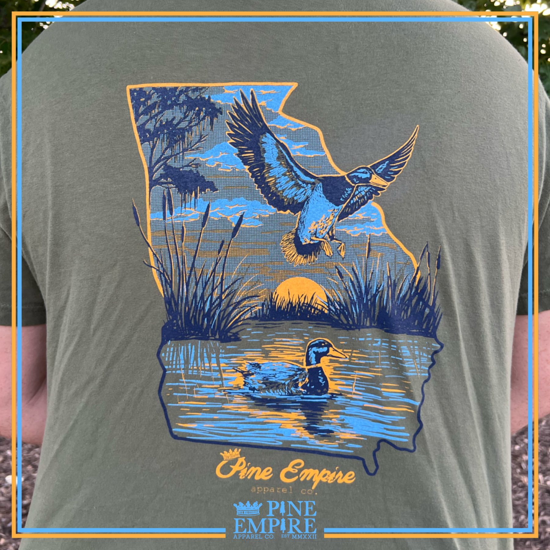 Sometimes, a design doesn’t need much of a description. “Ducks at Dawn” happens to be one of those designs. You know those beautiful fall mornings: sun breaking the darkness, a dappling of clouds reflecting the light while holding in the last gasps of night, and nature waking up.