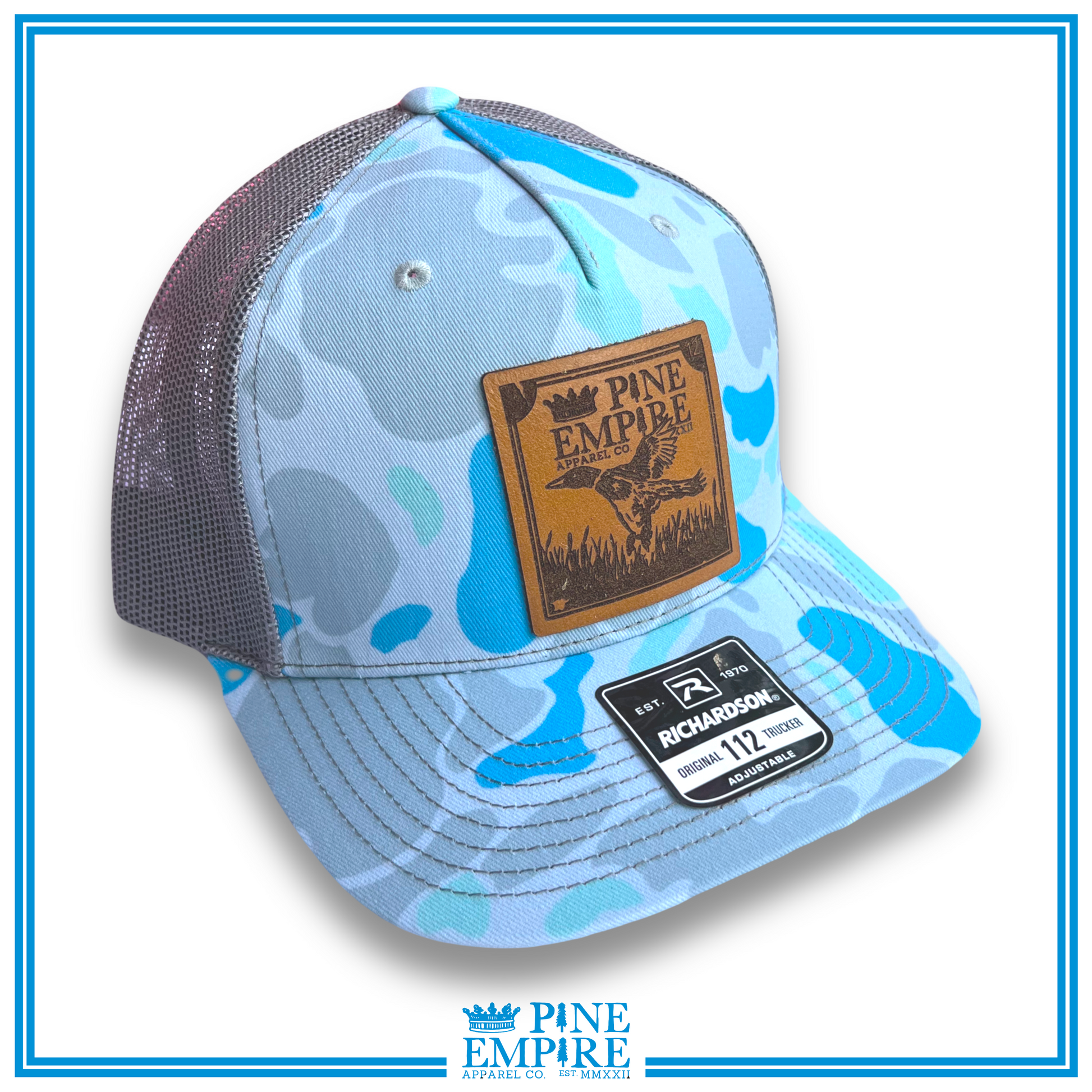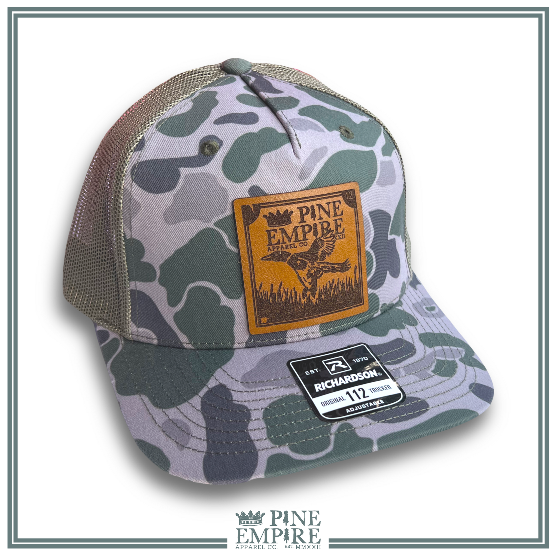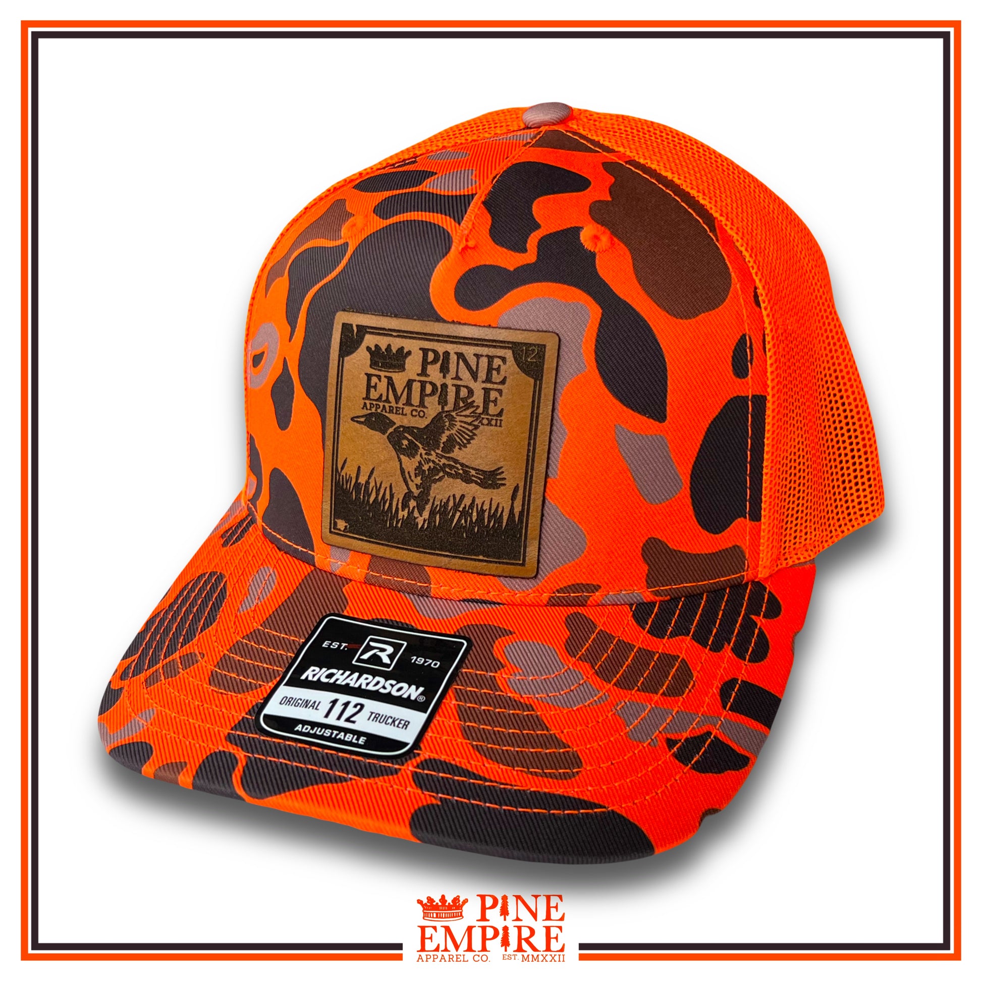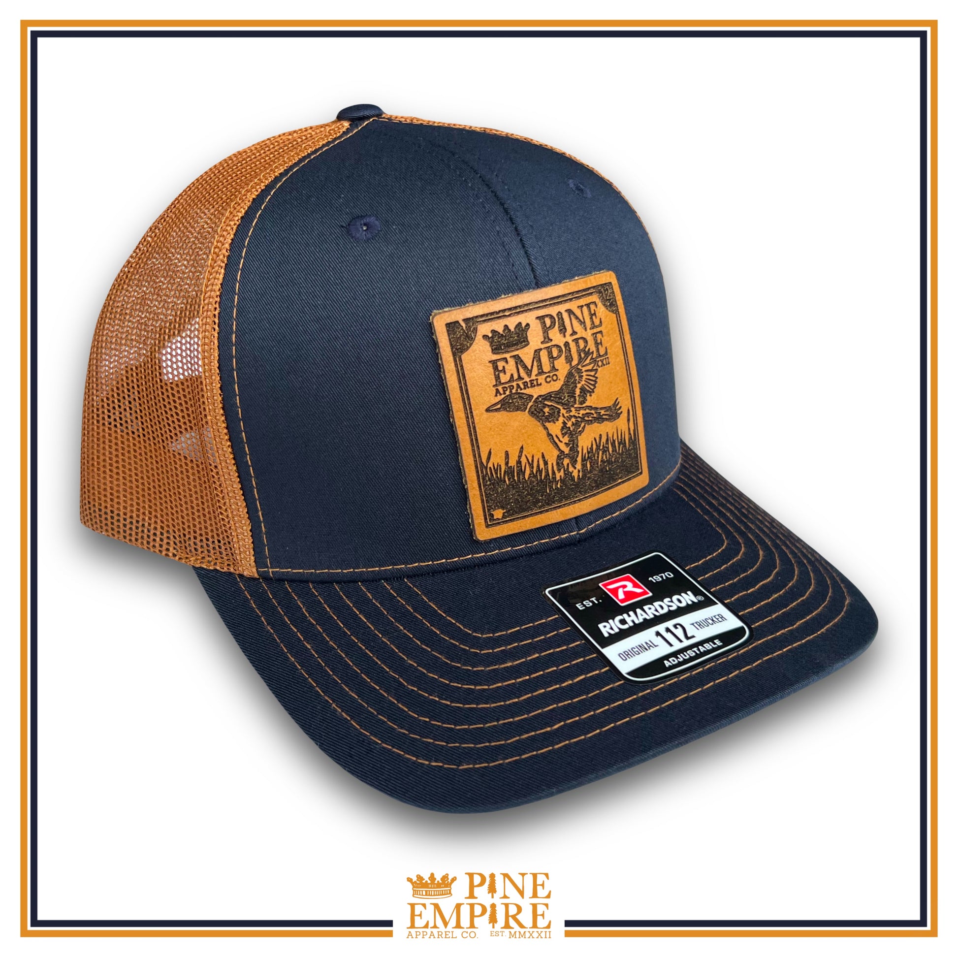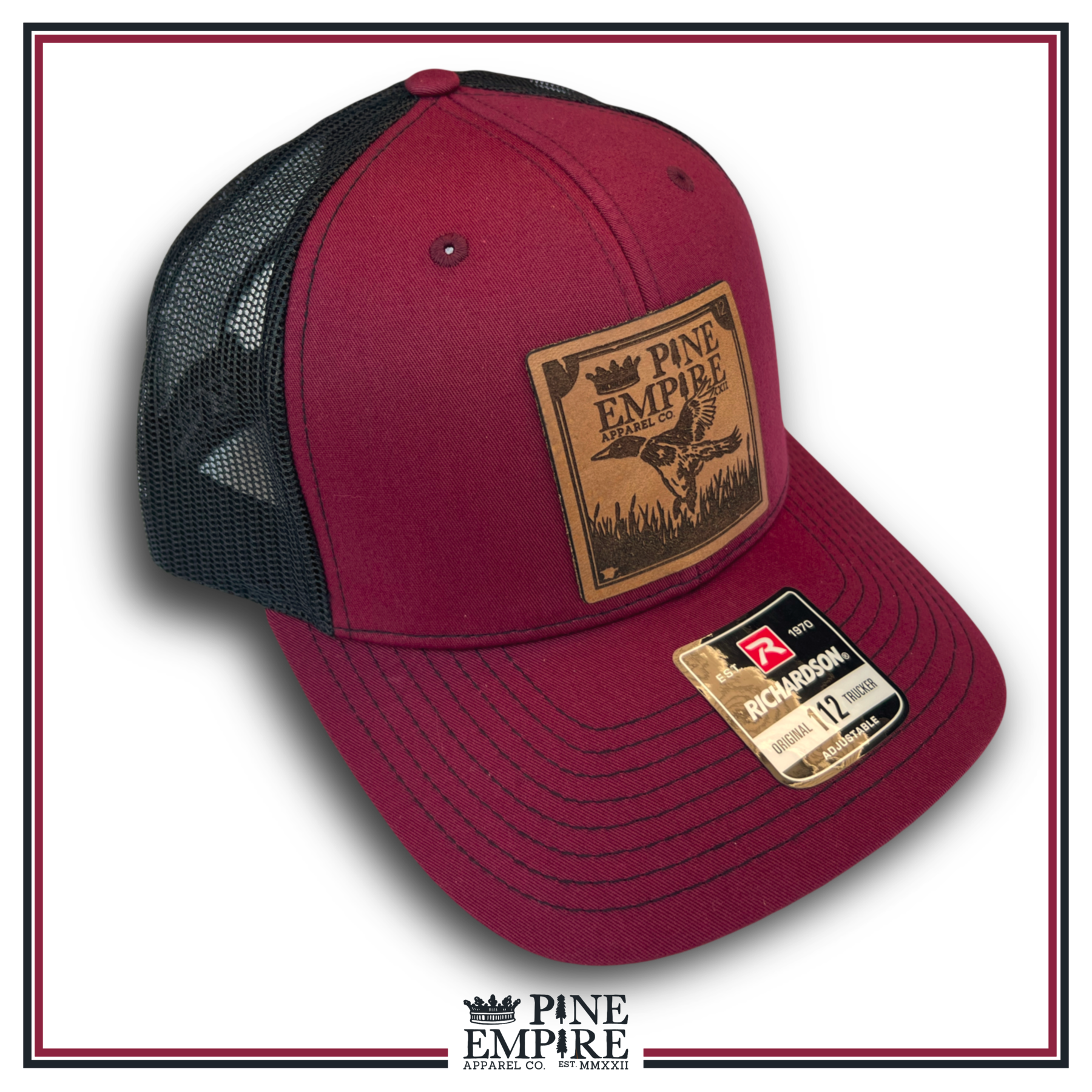 We went old school on this one by creating a distressed, vintage box of 12 gauge shells for the patch. Placed on Italian leather and added to a Richardson 112 snapback, this one is sure to fly!