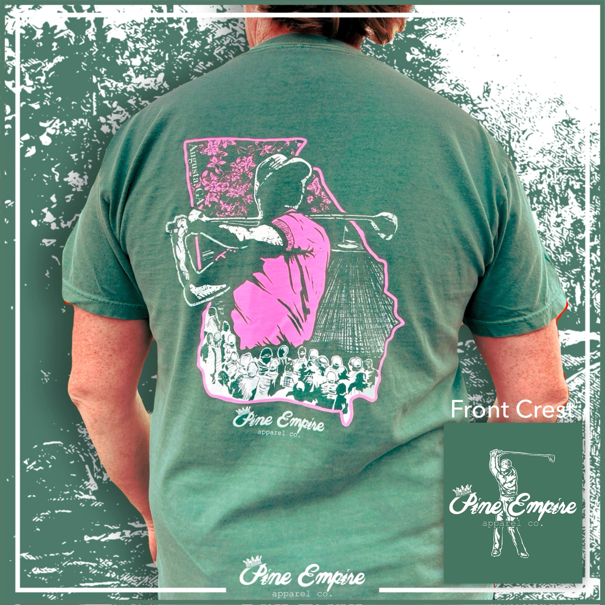 We love our golf designs (we hope you do as well) and we love to create something new every year. So, without further ado, we introduce to you "Swing Away '25". This year, our golfer, staring down his shot, is surrounded by pink, April azaleas and a patiently hushed gallery.